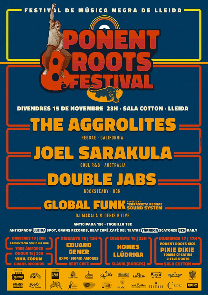 Otro año más vuelve el Ponent Roots Festival, un referente en lo que a música negra se refiere. No hay lugar a dudas de que este festival es ya uno de los eventos anuales más esperados en las comarcas de Ponent, por justamente poner su centralidad en estas y hacer del territorio un sello de identidad del festival, por el gran cartel de artistas que siempre trae y por el papel de dinamizadores culturales que tienen los Ponent Roots, dúo que está al frente del festival y de tantos otros eventos, pinchadas, etc., que hacen que Lleida no pueda considerarse en modo alguno una ciudad parada ni aburrida… Y es que no solo se limitan a un concierto, una noche de desenfreno (ya sea musical, bailador o etílico) y ya está. En absoluto: durante una semana se programan actividades de lo más variadas.