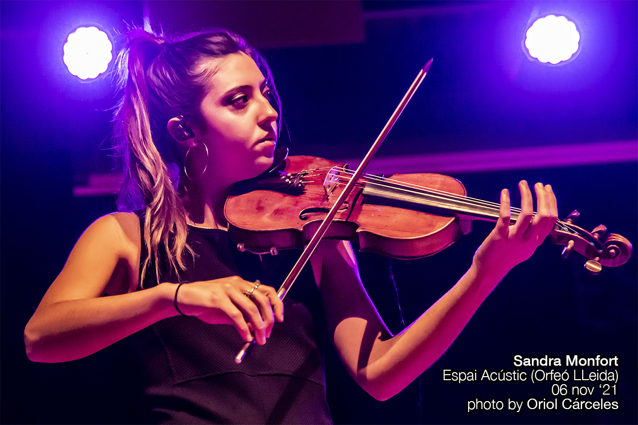 En formato trío – junto a su hermana Amanda y Jordi a los controles de la electrónica nave – y sin dar tregua arrancó con Pajarillo Verde, mostrando una conjunción impecable entre la fragilidad de su voz, el violín y las atmósferas electrónicas que rellenaban a la perfección el espacio sonoro. La formación de guitarra clásica brotaba, la poesía afloraba en Ni Cos ni Brida, momento en el que aprovechó para presentar sus acompañantes y también para compartir el significado de su primer trabajo. Con Migrem la totalidad del imaginario de Sandra, aflorando los olores a tierra, a mar, a los latidos más profundos, las voces de las dos hermanas entrelazándose con los sonidos para dar paso a La llebre, frenética pasión o pulsión sexual que, como un torrente, iba creciendo y apoderándose del espacio. La Pena volvía a encauzar y llevarnos con un vaivén a la pequeña zona de confort que su voz planteaba para dar paso a la parte poética – la que muestra su aparente fragilidad – Resina dejaba el escenario huérfano de compañía vocal a Sandra quien afrontaba un speech donde una poesía rabiosa, que estallaba de odio hacia quien no ha amado y ha oprimido a quien si que amaba, Nana contaba un dolor y continuaba con Mare, homenaje a los espacios seguros que todxs tenemos, que hacen fluir aquello que podemos necesitar.