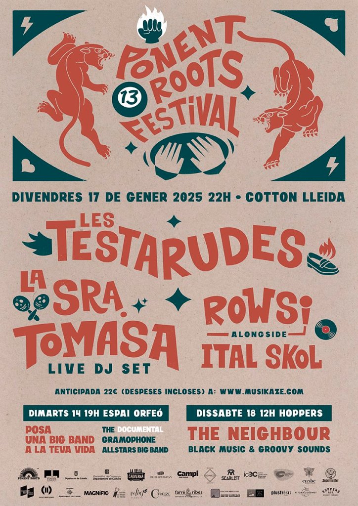 Como siempre, el viernes viene el plato fuerte y la sala Cotton se convierte en un hervidero que se mueve y agita al ritmo de las bandas y músicos. Se encargará de abrir la noche y también de cerrarla Rowsi, cantante emergente que lleva algunos singles a sus espaldas estos últimos dos años, junto con Ital Skol, colectivo de coleccionistas, selectores y difusores de música jamaicana que ya han venido en alguna otra ocasión a Lleida. El Ponent Roots contará también con la Sra. Tomasa, cuya frenética mezcla de ritmos latinos y urbanos se ha ganado una buena legión de seguidores. No nos podemos dejar tampoco a Les Testarudes, un grupo formado por chicas de Baix Llobregat que inició su actividad en 2023 y que desde entonces ya se han coronado como uno de los grupos sobresalientes en conciertos y festivales. El año pasado, de hecho, ya estuvieron en el Ponent Roots. En un principio su repertorio se componía de clásicos del ska y del reggae que hacían delicias tanto de veteranos seguidores de los sonidos jamaicanos como de neófitos recién llegados a ellos. Sin embargo, últimamente han aparecido singles propios de lo que será su primer álbum. La noche promete muchos bailoteos asegurados.