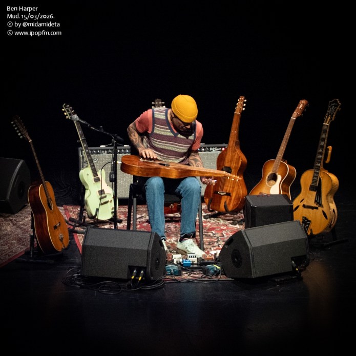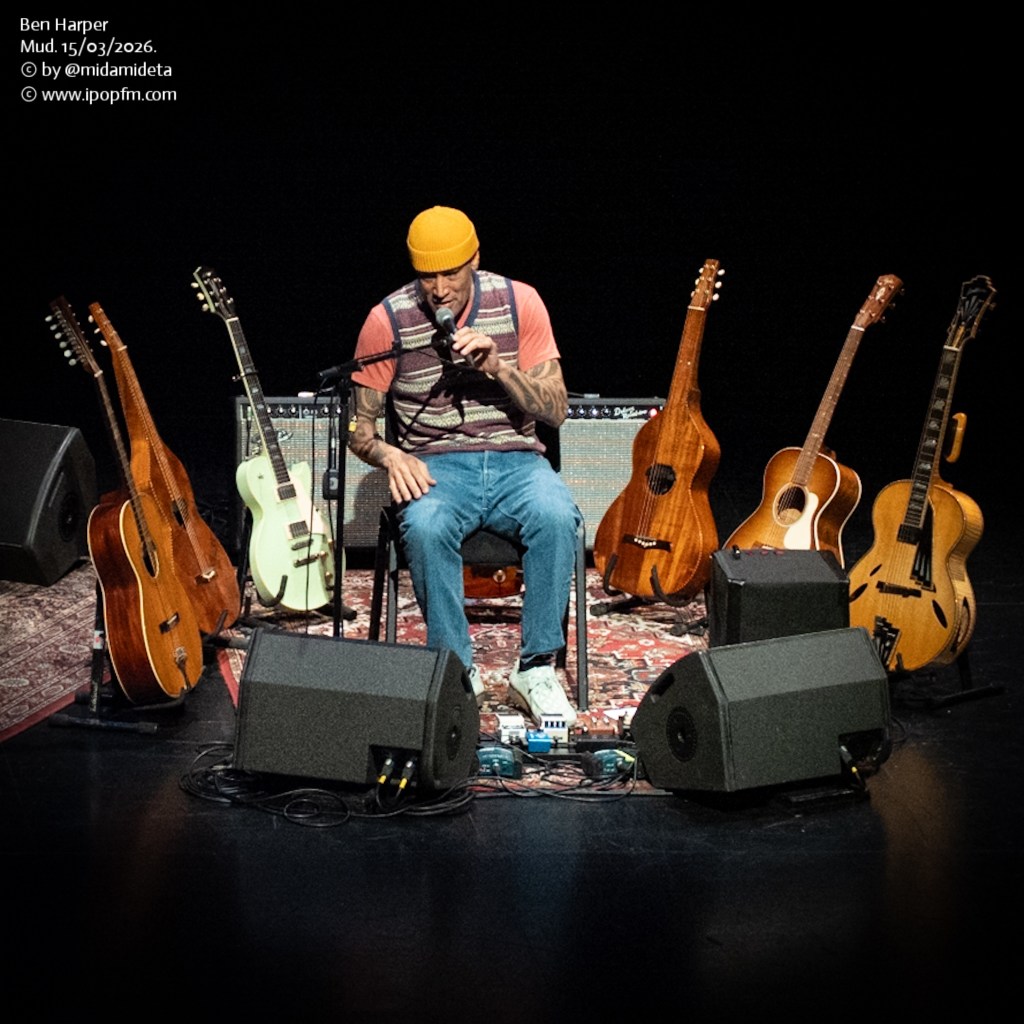 La escena era sobria: siete guitarras alineadas como si aguardaran su turno, un piano a un lado y Harper sentado en una silla en el centro del escenario. Nada más. Pero bastaron unos pocos acordes para entender que aquella austeridad escénica no era una limitación, sino una declaración de intenciones.
